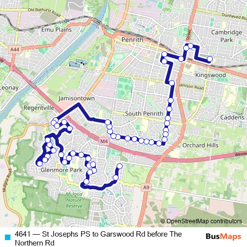 The first stop of the 4641 bus route is St Joseph's Primary School, Richmond Rd and the last stop is Surveyors Creek Public School, St Andrews Dr. 4641 (St Josephs PS to Garswood Rd before The Northern Rd) is operational during entre semana.