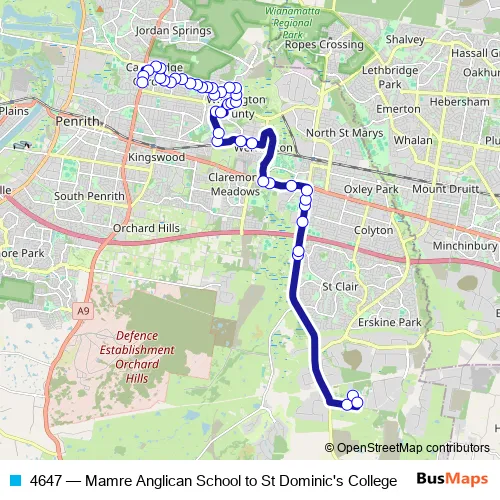 The first stop of the 4647 bus route is Mamre Anglican School, Bakers Lane and the last stop is Richmond St Before Boomerang Pl. 4647 (Mamre Anglican School to St Dominic's College) is operational during entre semana.
