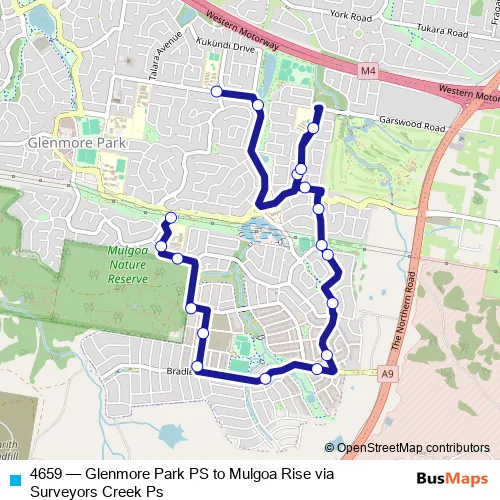 Click here to view the nearest 4659 - Glenmore Park PS to Mulgoa Rise via Surveyors Creek Ps bus stop.