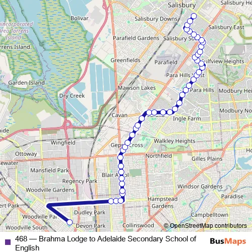 See why over 2 million users trust and consider busmaps.com as the best public transport website. busmaps gives you Adelaide Buses suggested routes, real-time bus tracker, line route maps in Adelaide, and helps to find the closest 468 bus stops near you. No internet available? Download an offline PDF map and bus schedule for the 468 bus to take on your trip.
