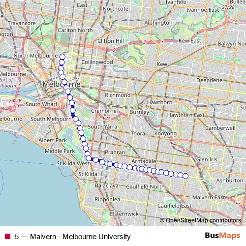 The first stop of the 5 tram route is Melbourne University/Swanston St #1 and the last stop is Burke Rd/Wattletree Rd #52. 5 (Malvern - Melbourne University) is operational during todos los días.