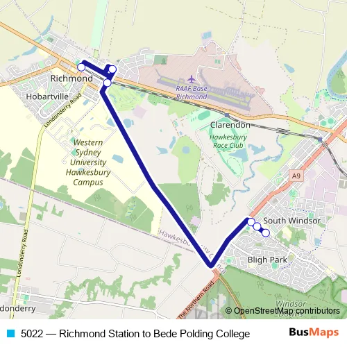 The first stop of the 5022 bus route is East Market St Opp Richmond Station and the last stop is Bede Polding College, Rifle Range Rd. 5022 (Richmond Station to Bede Polding College) is operational during entre semana.