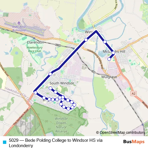 The first stop of the 5029 bus route is Bede Polding College, Rifle Range Rd and the last stop is Windsor High School, Mulgrave Rd. 5029 (Bede Polding College to Windsor HS via Londonderry) is operational during entre semana.