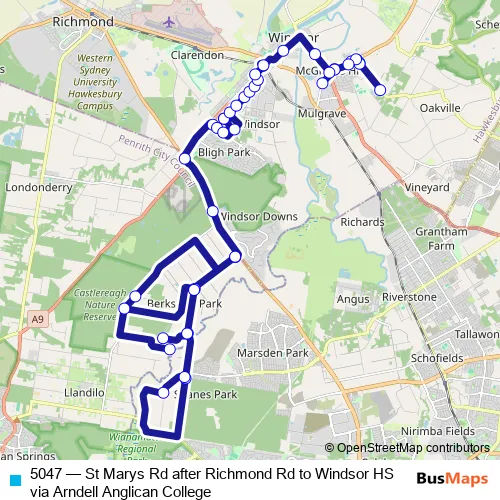 The first stop of the 5047 bus route is St Marys Rd After Richmond Rd (Hail And Ride) and the last stop is Windsor High School, Mulgrave Rd. 5047 (St Marys Rd after Richmond Rd to Windsor HS via Arndell Anglican College) is operational during entre semana.