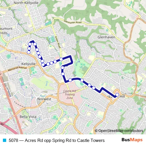 The first stop of the 5078 bus route is Acres Rd Opp Spring Rd and the last stop is Castle Hill Station, Old Castle Hill Rd, Stand E. 5078 (Acres Rd opp Spring Rd to Castle Towers) is operational during entre semana.