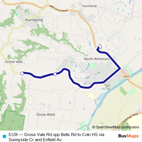 The first stop of the 5128 bus route is Grose Vale Rd Opp Bells Rd and the last stop is Colo High School. 5128 (Grose Vale Rd opp Bells Rd to Colo HS via Sunnyside Cr and Enfield Av) is operational during entre semana.