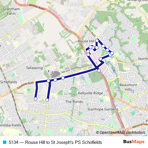 The first stop of the 5134 bus route is North West Twy Opp Rouse Hill Station and the last stop is St Josephs Primary School, Alex Av. 5134 (Rouse Hill to St Joseph's PS Schofields) is operational during entre semana.