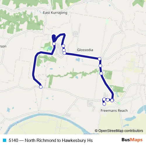 The first stop of the 5140 bus route is Kurmond Rd At Spinks Rd and the last stop is Hawkesbury High School. 5140 (North Richmond to Hawkesbury Hs) is operational during entre semana.