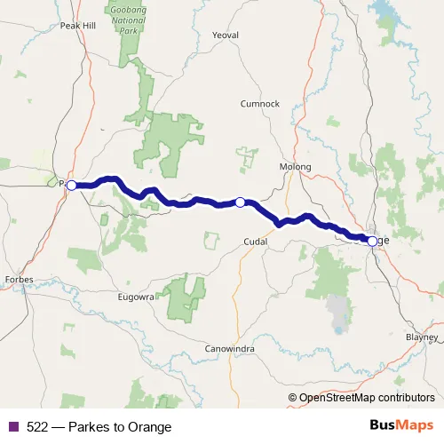 The first stop of the 522 bus route is Parkes Station, Coach Stop and the last stop is Orange Station, Coach Bay 1. 522 (Parkes to Orange) is operational during todos los días.