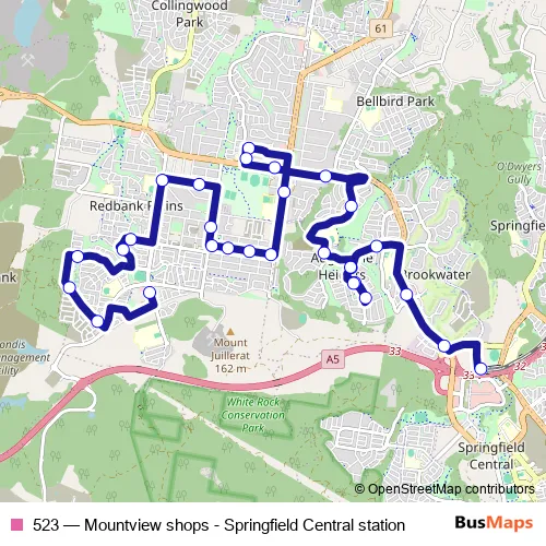The first stop of the 523 bus route is Springfield Central station, stop A and the last stop is School Rd at Mountview Shopping Centre. 523 (Mountview shops - Springfield Central station) is operational during todos los días.
