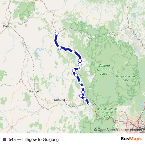 The first stop of the 543 bus route is Lithgow Station, Railway Pde, Bay 3 and the last stop is Herbert St Opp White St. 543 (Lithgow to Gulgong) is operational during entre semana.