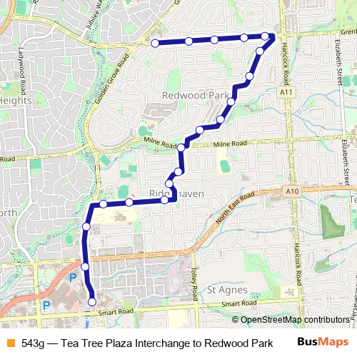 The first stop of the 543g bus route is Zone F Tea Tree Plaza Interchange - East side and the last stop is Stop 58A Grenfell Rd - South side. 543g (Tea Tree Plaza Interchange to Redwood Park) is operational during todos los días.