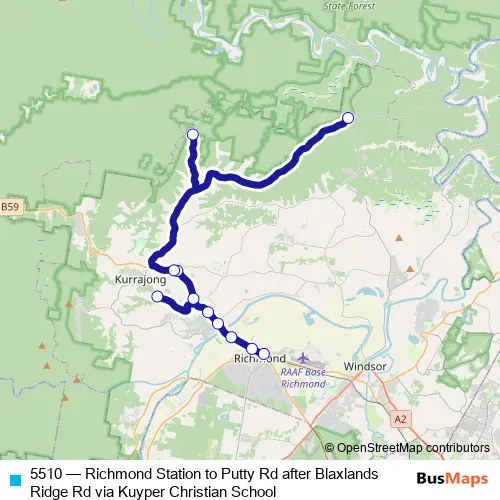 The first stop of the 5510 bus route is Richmond Station, East Market St and the last stop is Putty Rd After Blaxlands Ridge Rd. 5510 (Richmond Station to Putty Rd after Blaxlands Ridge Rd via Kuyper Christian School) is operational during entre semana.