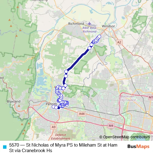 The first stop of the 5570 bus route is St Nicholas Of Myra School Lethbridge St and the last stop is Mileham St At Ham St. 5570 (St Nicholas of Myra PS to Mileham St at Ham St via Cranebrook Hs) is operational during entre semana.