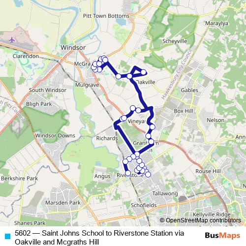 The first stop of the 5602 bus route is St Johns Primary School, Mcculloch St and the last stop is Riverstone Station, Riverstone Pde. 5602 (Saint Johns School to Riverstone Station via Oakville and Mcgraths Hill) is operational during entre semana.