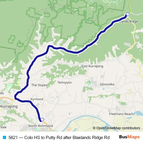The first stop of the 5621 bus route is Colo High School and the last stop is Putty Rd After Blaxlands Ridge Rd. 5621 (Colo HS to Putty Rd after Blaxlands Ridge Rd) is operational during entre semana.