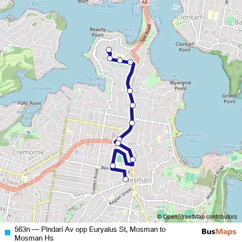 Click here to view the nearest 563n - Pindari Av opp Euryalus St, Mosman to Mosman Hs bus stop.