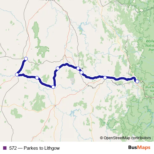 The first stop of the 572 bus route is Parkes Station, Coach Stop and the last stop is Lithgow Station, Railway Pde, Bay 1. 572 (Parkes to Lithgow) is operational during todos los días.