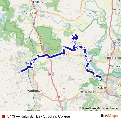 The first stop of the 5773 bus route is Maroochydore Multi Sports Complex hail 'n' ride and the last stop is St John's Catholic College. 5773 (Kuluin/Bli Bli - St Johns College) is operational during entre semana.