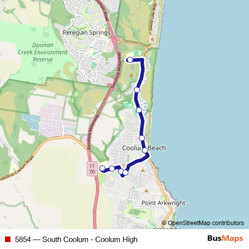 The first stop of the 5854 bus route is Coolum State Primary School and the last stop is Coolum High School. 5854 (South Coolum - Coolum High) is operational during entre semana.