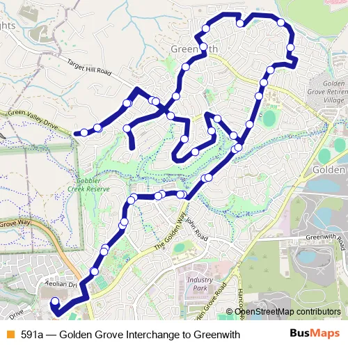 The first stop of the 591a bus route is Zone D Golden Grove Interchange and the last stop is Zone D Golden Grove Interchange. 591a (Golden Grove Interchange to Greenwith) is operational during entre semana.