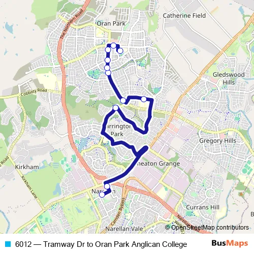 The first stop of the 6012 bus route is Narellan Town Centre, Elyard St and the last stop is Oran Park Anglican College, Shannon Way. 6012 (Tramway Dr to Oran Park Anglican College) is operational during entre semana.
