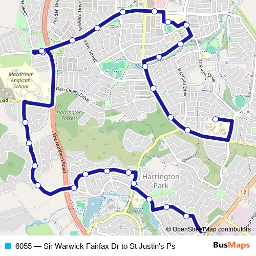The first stop of the 6055 bus route is Sir Warwick Fairfax Dr Opp Harrinson Av and the last stop is St Benedicts And St Justins Schools, Hollows Dr. 6055 (Sir Warwick Fairfax Dr to St Justin's Ps) is operational during entre semana.