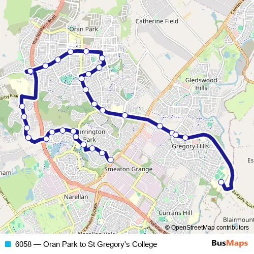 The first stop of the 6058 bus route is Sir Warwick Fairfax Dr Opp Harrinson Av and the last stop is St Gregory's College Campbelltown. 6058 (Oran Park to St Gregory's College) is operational during entre semana.
