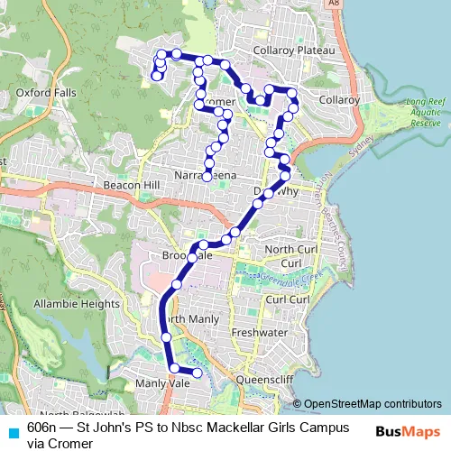 The first stop of the 606n bus route is St John's Primary School, Oliver St and the last stop is Nbsc Mackellar Girls, Campbell Pde, Stand K. 606n (St John's PS to Nbsc Mackellar Girls Campus via Cromer) is operational during entre semana.