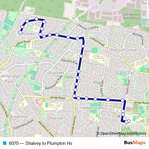 The first stop of the 6070 bus route is Sedgman Cres Before Koomooloo Cres and the last stop is Good Shepherd Primary School, Hyatts Rd. 6070 (Shalvey to Plumpton Hs) is operational during entre semana.