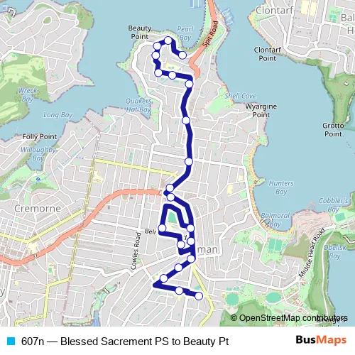 The first stop of the 607n bus route is Blessed Sacrament Primary School, Milton Av and the last stop is Pearl Bay Av Opp Moss Lane. 607n (Blessed Sacrement PS to Beauty Pt) is operational during entre semana.