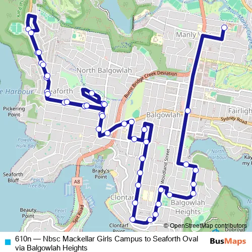 The first stop of the 610n bus route is Nbsc Mackellar Girls, Quirk Rd, Stand B and the last stop is Seaforth Public School, Frenchs Forest Rd. 610n (Nbsc Mackellar Girls Campus to Seaforth Oval via Balgowlah Heights) is operational during entre semana.