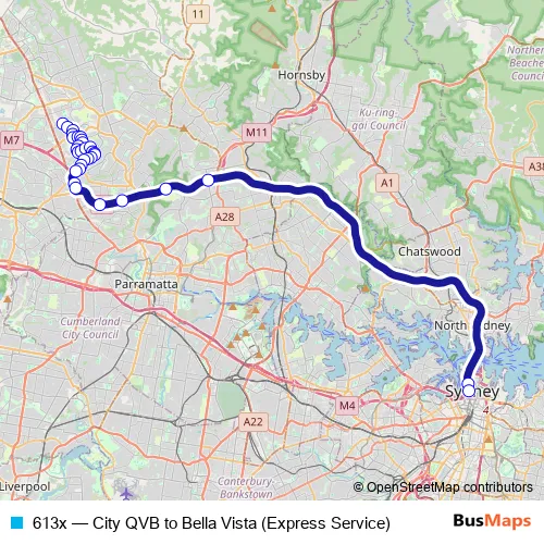 Click here to view the nearest 613x - City QVB to Bella Vista (Express Service) bus stop.