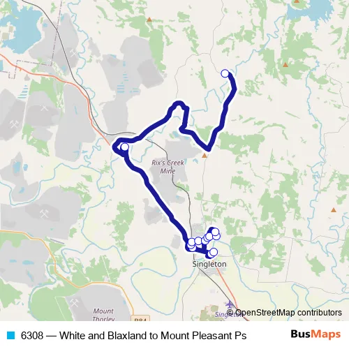 The first stop of the 6308 bus route is Singleton Public Library, Queen St and the last stop is Mt Pleasant Public School, Goorangoola Rd. 6308 (White and Blaxland to Mount Pleasant Ps) is operational during entre semana.