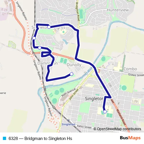 The first stop of the 6328 bus route is Darlington Rd After Dunolly Rd and the last stop is Singleton High School, King St. 6328 (Bridgman to Singleton Hs) is operational during entre semana.