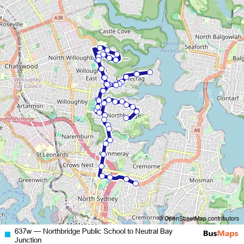 The first stop of the 637w bus route is Northbridge Public School, Sailors Bay Rd and the last stop is Neutral Bay Junction, Military Rd, Stand E. 637w (Northbridge Public School to Neutral Bay Junction) is operational during entre semana.