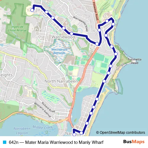 The first stop of the 642n bus route is Mater Maria College and the last stop is Narrabeen Shops, Pittwater Rd. 642n (Mater Maria Warriewood to Manly Wharf) is operational during entre semana.