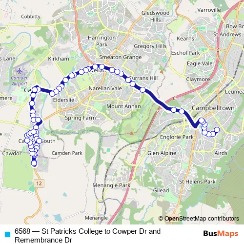 The first stop of the 6568 bus route is St Patrick's College, St Johns Rd and the last stop is Cowper Dr At Old Hume Hwy. 6568 (St Patricks College to Cowper Dr and Remembrance Dr) is operational during entre semana.