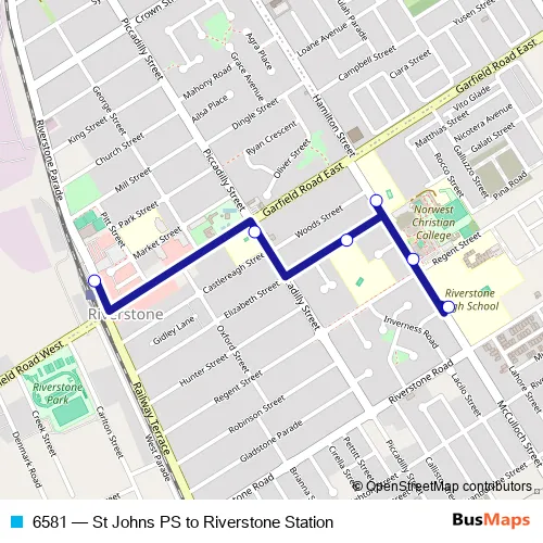 The first stop of the 6581 bus route is St Johns Primary School, Mcculloch St and the last stop is Riverstone Station, Riverstone Pde. 6581 (St Johns PS to Riverstone Station) is operational during entre semana.