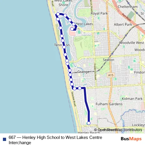 The first stop of the 667 bus route is Stop School Henley High School Cudmore Tce and the last stop is West Lakes Interchange Terminus. 667 (Henley High School to West Lakes Centre Interchange) is operational during entre semana.