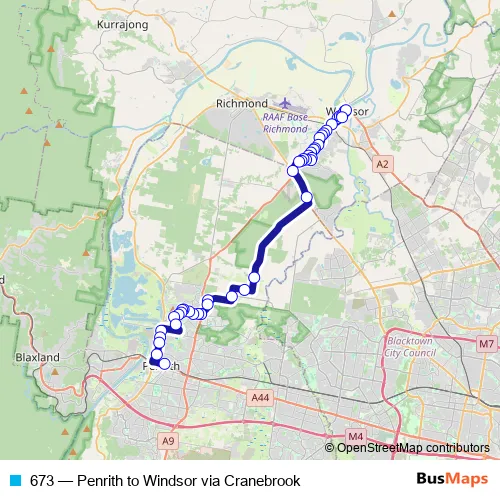 The first stop of the 673 bus route is George St Opp Windsor Public School and the last stop is Penrith Station, Stand F. 673 (Penrith to Windsor via Cranebrook) is operational during todos los días.