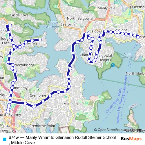 The first stop of the 674w bus route is Manly Wharf, Belgrave St, Stand E and the last stop is Glenaeon Rudolf Steiner School, Greenfield Av. 674w (Manly Wharf to Glenaeon Rudolf Steiner School, Middle Cove) is operational during entre semana.