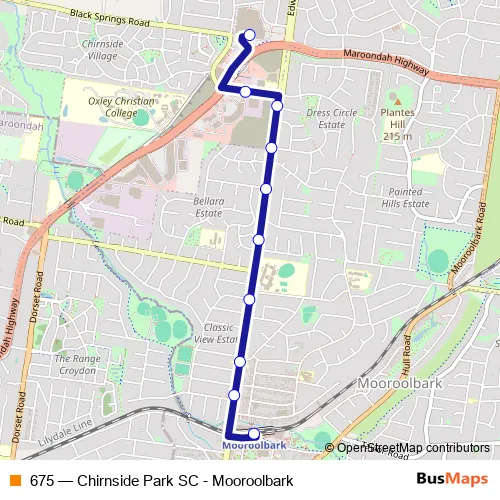 The first stop of the 675 bus route is Mooroolbark Station/Brice Ave and the last stop is Chirnside Park SC/Maroondah Hwy. 675 (Chirnside Park SC - Mooroolbark) is operational during entre semana.