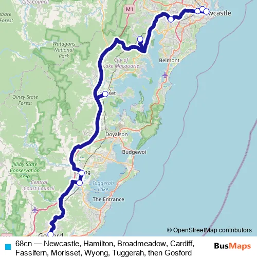 Click here to view the nearest 68cn - Newcastle, Hamilton, Broadmeadow, Cardiff, Fassifern, Morisset, Wyong, Tuggerah, then Gosford bus stop.
