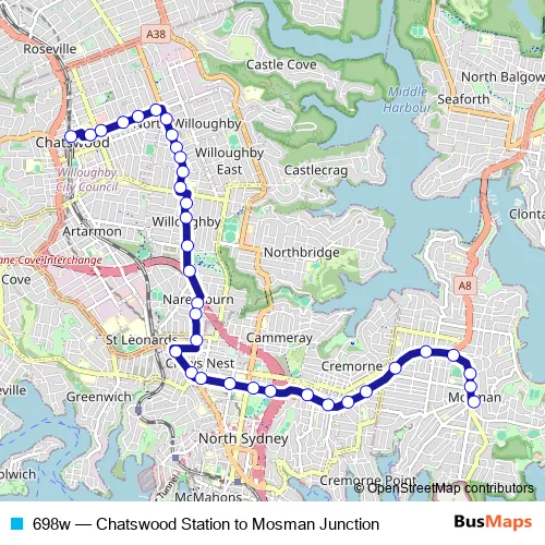 Click here to view the nearest 698w - Chatswood Station to Mosman Junction bus stop.