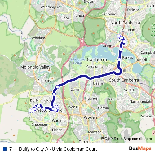 See why over 2 million users trust and consider busmaps.com as the best public transport website. busmaps gives you Canberra Buses suggested routes, real-time bus tracker, line route maps in Canberra, and helps to find the closest 7 bus stops near you. No internet available? Download an offline PDF map and bus schedule for the 7 bus to take on your trip.