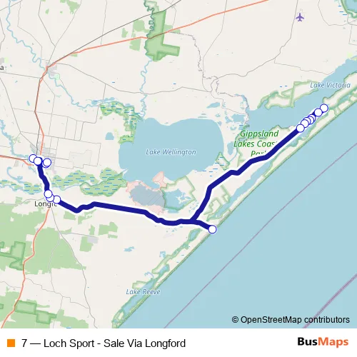 The first stop of the 7 bus route is National Park Ent/National Park Rd and the last stop is Sale Hospital/Guthridge Pde. 7 (Loch Sport - Sale Via Longford) is operational during todos los días.