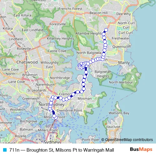 The first stop of the 711n bus route is Broughton St At Fitzroy St and the last stop is Warringah Mall, Pittwater Rd, Stand D. 711n (Broughton St, Milsons Pt to Warringah Mall) is operational during entre semana.