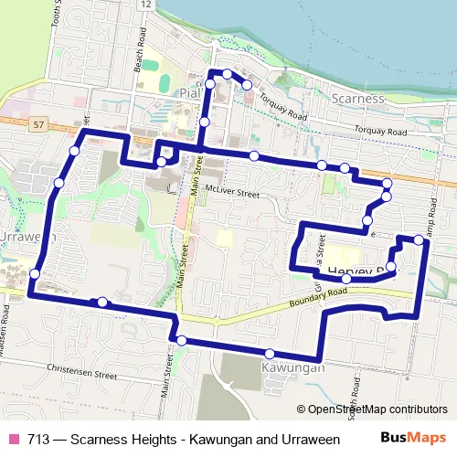 The first stop of the 713 bus route is Torquay Road at Taylor Street and the last stop is Central Ave at Stockland Hervey Bay. 713 (Scarness Heights - Kawungan and Urraween) is operational during todos los días.