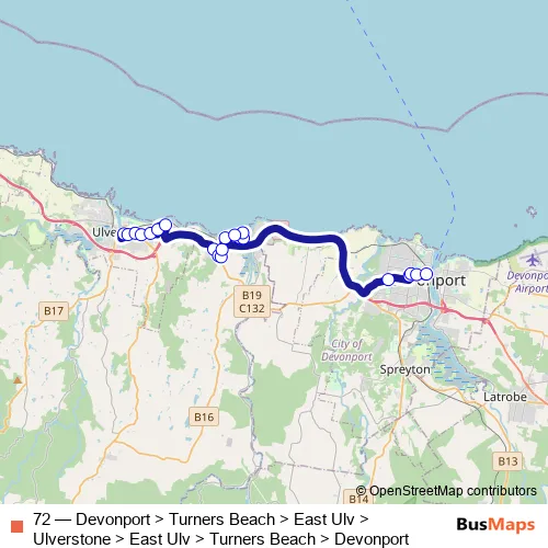 Bus 72 - Devonport > Turners Beach > East Ulv > Ulverstone > East Ulv > Turners Beach > Devonport Schedule in Turners Beach